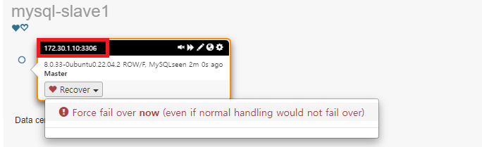 오케스트레이터의 장애조치 모드 기본값은 수동이다. 수동으로 장애조치는 관리자가 문제를 인지하고 직접 장애 조치를 진행해야 한다. 현재 응답이 없는 mysql-master(172.30.1.97) 서버에서 [Recover]를 클릭한다. Failover 가능한 서버 목록에서, mysql-salve1(172.30.1.10)서버로 장애조치를 진행한다.