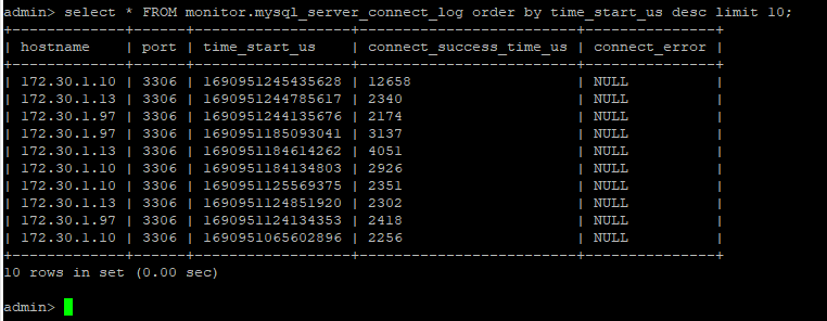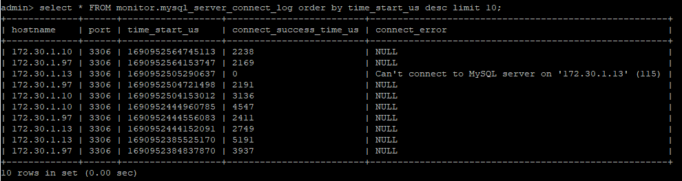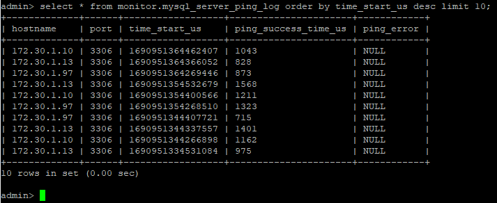 | select * from monitor.mysql_server_ping_log order by time_start_us desc limit 10; |