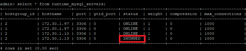 현재 실시간의 노드의 상태를 확인하려면 runtime_mysql_servers 테이블의 정보를 확인한다. 아래 스크립트를 사용하여 중지된 서버의 상태가 SHUNNED로 표시된 것을 확인할 수 있다.