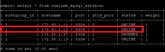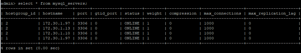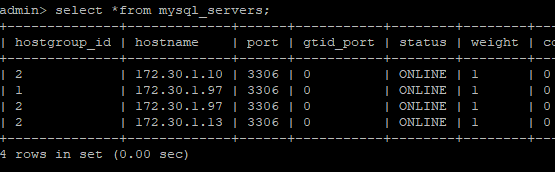 현재 호스트 그룹에 등록된 서버들의 목록을 확인할 수 있다. hostgroup_id = 1 은 write가 가능한 그룹이며, hostgroup_id = 2는 읽기가 가능한 그룹이다.
