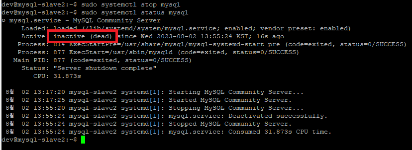 mysql-slave2 서버에 접속하여, MySQL 서비스를 중지한다.