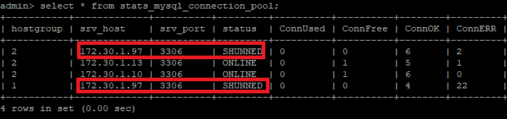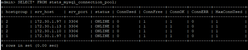 아래 스크립트에서는 현재 연결된 커넥션 풀에 대한 상태를 확인할 수 있다. 실제 연결에 문제가 발생할 경우 stats_mysql_connection_pool의 status 컬럼에 상태가 변경되는 것을 확인할 수 있다.