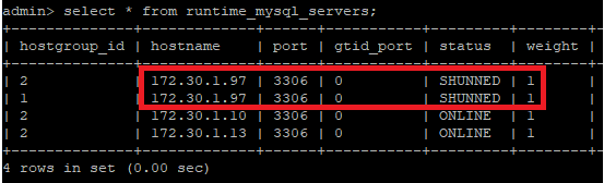 현재 실시간의 노드의 상태를 확인하려면 runtime_mysql_servers 테이블의 정보를 확인한다. 아래 스크립트를 사용하여 중지된 서버의 상태가 SHUNNED로 표시된 것을 확인할 수 있다.