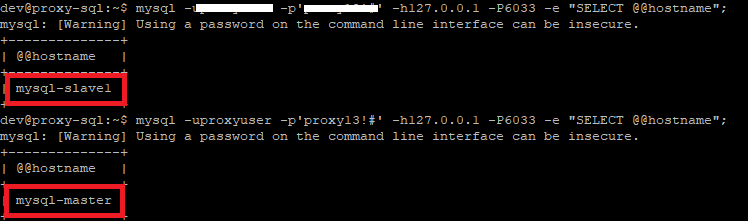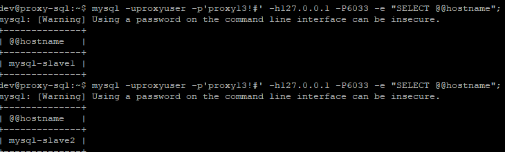 | mysql -uubuntu -p123456 -h127.0.0.1 -P6033 -e "SELECT @@hostname"; |