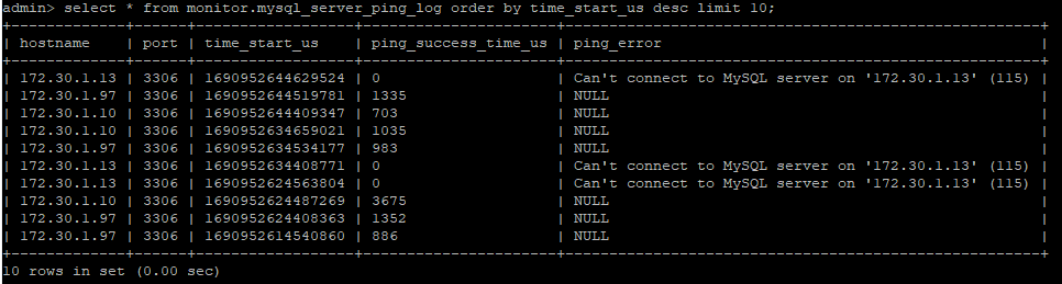 | select * from monitor.mysql_server_ping_log order by time_start_us desc limit 10; |