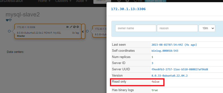 새로 구성된 클러스터를 살펴보면 이전 slave역할이었던 mysql-slave2(172.30.1.13)서버가 master로 승격된 것을 확인할 수 있다. 그리고 나머지 slave 서버가 새로운 master를 복제하고 있다.