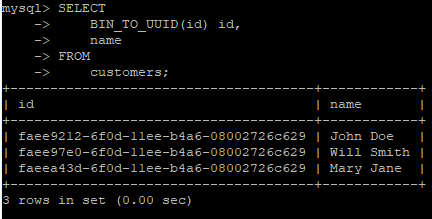 | SELECT BIN_TO_UUID(id) id, name FROM customers; |
