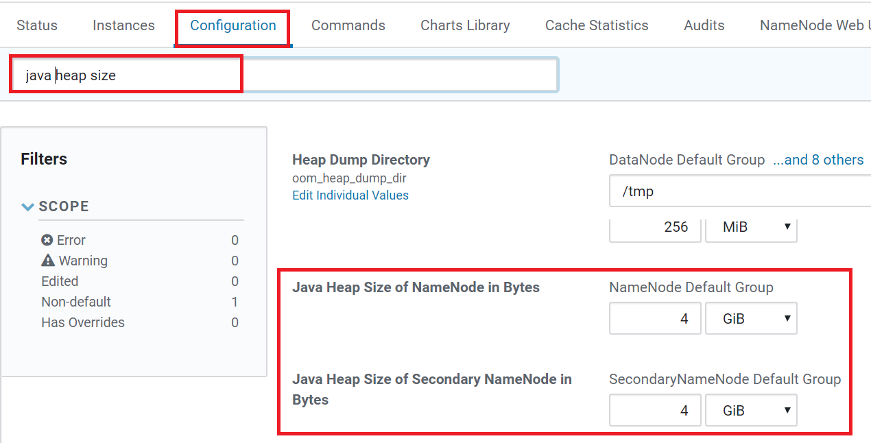 NameNode를 Master and Slave로 구성하였을때, NameNode간의 힙메모리 설정이 다른 경우 경고가 발생한다. (서비스 장애가 발생하는 것은 아님) Cloudera Hadoop Manager에서는 아래와 같은 메뉴에서 Heap Memory Size를 설정할 수 있다.