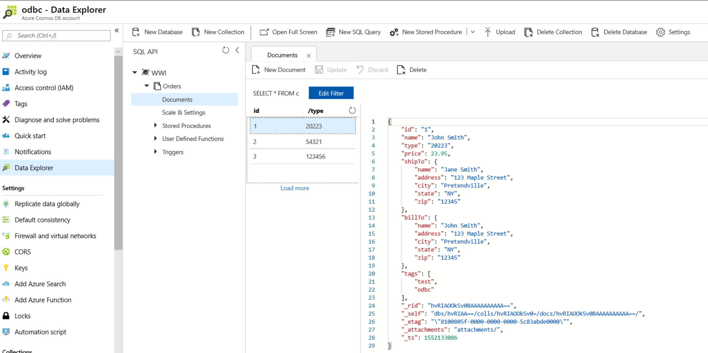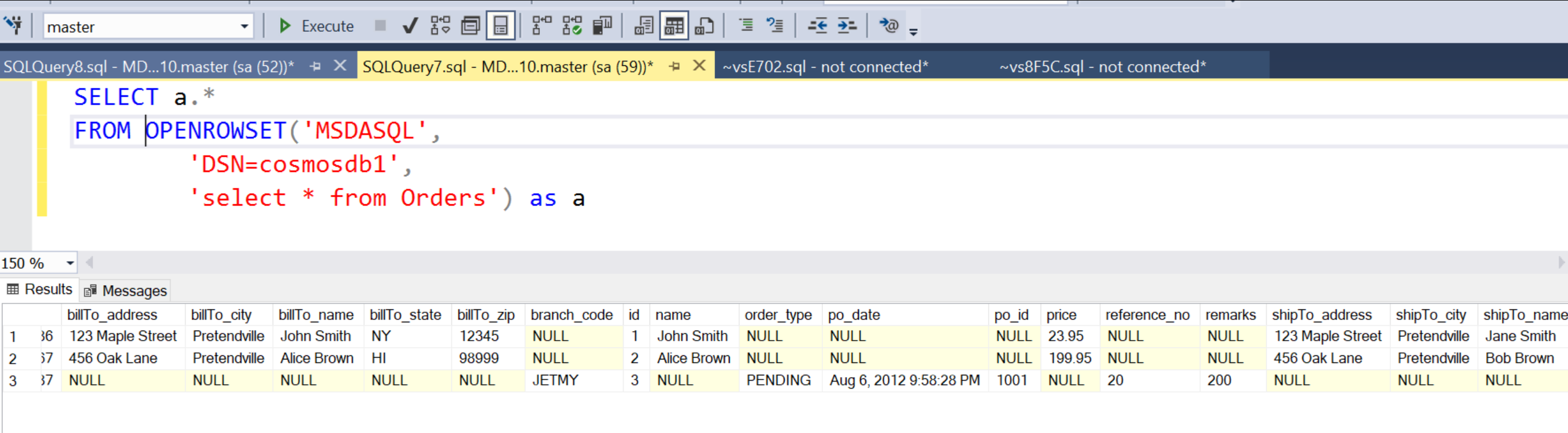 SELECT a.* FROM OPENROWSET('MSDASQL', 'DSN=cosmosdb1', 'select * from Orders where billto_Name = ''John Smith''') as a |