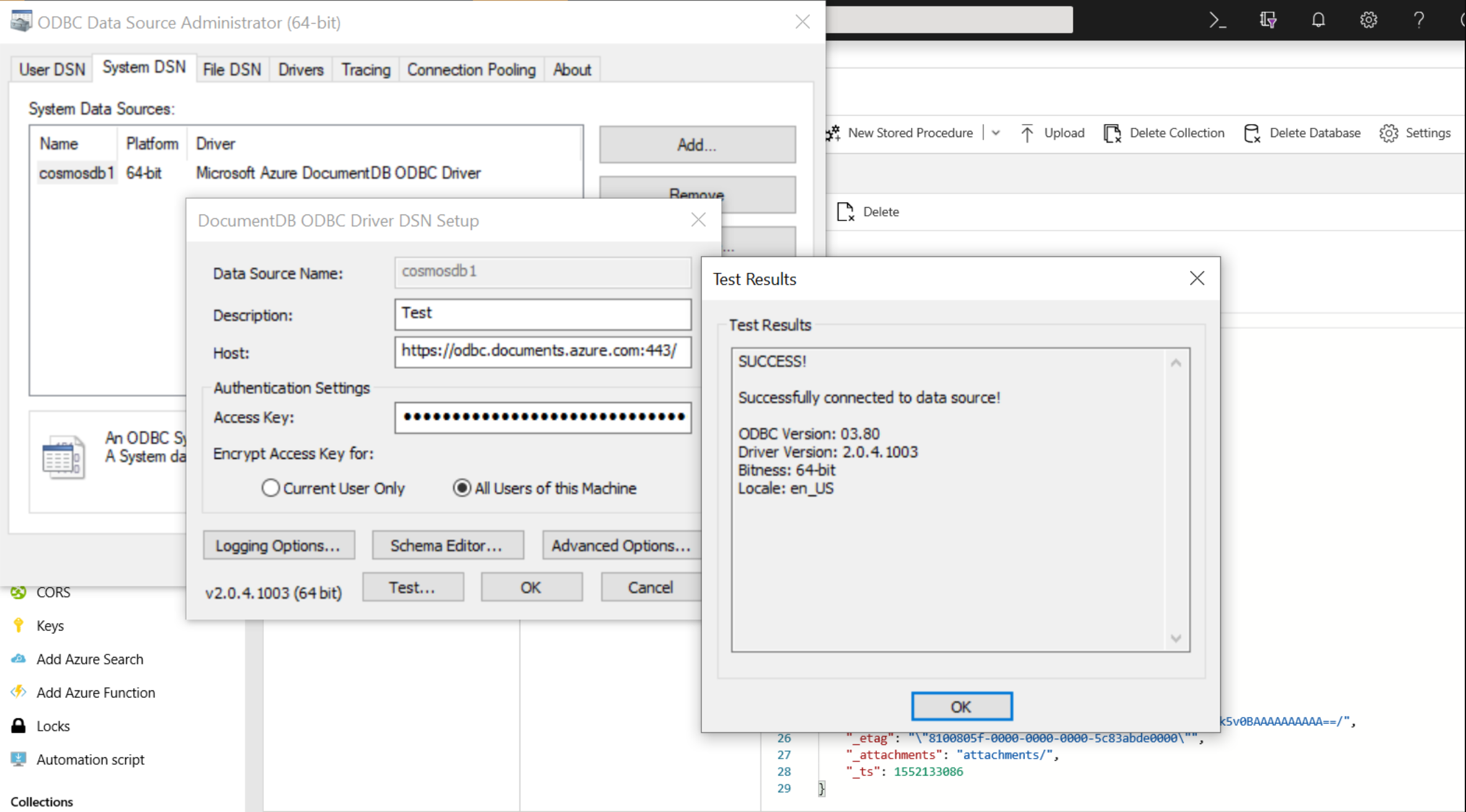 SQL Server가 설치된 컴퓨터에 CosmosDB용 ODBC 드라이버를 설치해야한다. 이 드라이버를 설치하면 DSN에서 ODBC 소스를 설정하고 연결을 테스트해야한다.