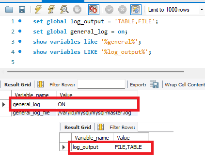 | set global log_output = 'TABLE,FILE'; set global general_log = on; show variables like '%general%'; show variables LIKE '%log_output%'; |