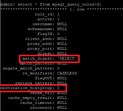 쿼리 타입에 따라 각 그룹으로 분기할 룰을 지정한다. SELECT쿼리는 hostgroup_id = 2의 서버로 호출하고, 나머지 쿼리는 hostgroup_id = 1 서버로 호출한다. 이때 동일 호스트 그룹에 2대 이상의 서버가 있으면 ProxySQL에서 라운드로빈으로 로드밸런싱을 한다.