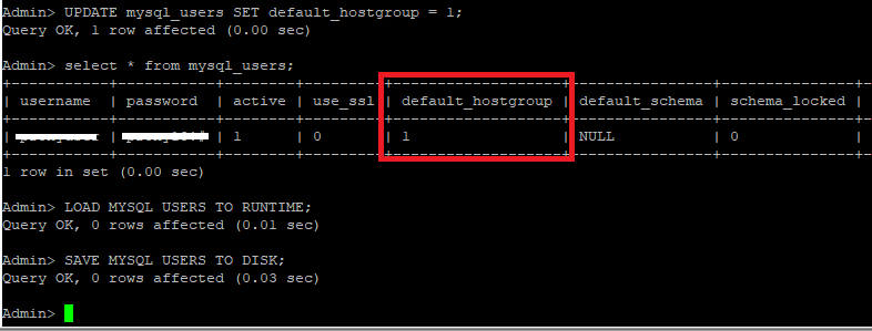 | -- hostgroup_id를 기본 1로 지정 UPDATE mysql_users SET default_hostgroup = 1; -- 변경사항 반영 LOAD MYSQL USERS TO RUNTIME; SAVE MYSQL USERS TO DISK; |
