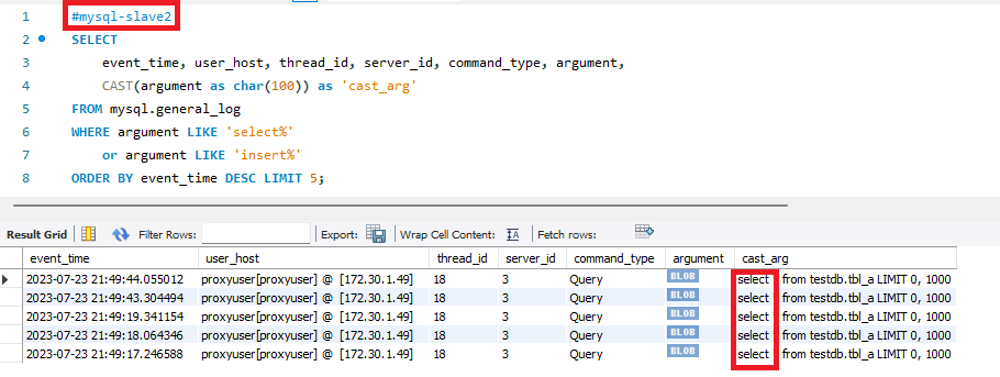 | #mysql-slave2 SELECT event_time, user_host, thread_id, server_id, command_type, argument, CAST(argument as char(100)) as 'cast_arg' FROM mysql.general_log WHERE argument LIKE 'select%' or argument LIKE 'insert%' ORDER BY event_time DESC LIMIT 5; |