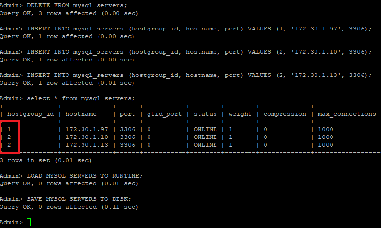 proxy-sql 데이터베이스에 접근이 되었으면, 아래 스크립트를 사용하여, write및 read 서버를 등록한다. 이때 필요한 그룹을 지정할 수 있도록 한다.