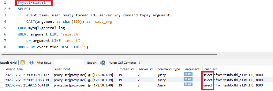 | #mysql-slave1 SELECT event_time, user_host, thread_id, server_id, command_type, argument, CAST(argument as char(100)) as 'cast_arg' FROM mysql.general_log WHERE argument LIKE 'select%' or argument LIKE 'insert%' ORDER BY event_time DESC LIMIT 5; |