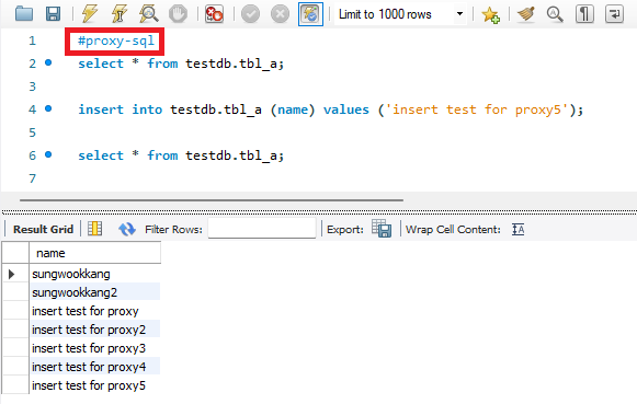 | #proxy-sql select * from testdb.tbl_a; insert into testdb.tbl_a (name) values ('insert test for proxy5'); select * from testdb.tbl_a; |