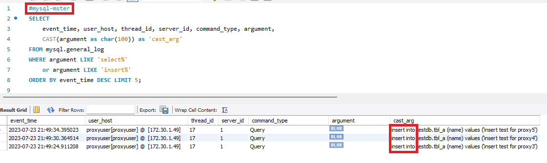 mysql-master 서버에서 아래 스크립트를 사용하여, 제네럴로그를 살펴본다. argument컬럼이 BLOB 타입이어서, 문자형식으로 캐스팅하였다. 쿼리 결과를 살펴보면 INSERT 쿼리만 기록된 것을 확인할 수 있다.