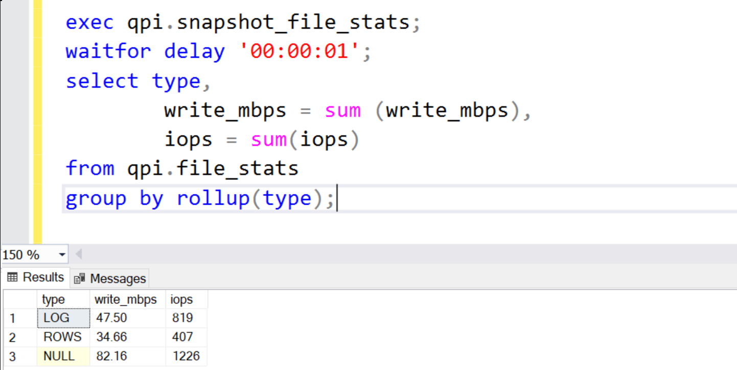 select type, write_mbps = sum(write_mbps), iops = sum(iops) from qpi.file_stats group by rollup (type); |