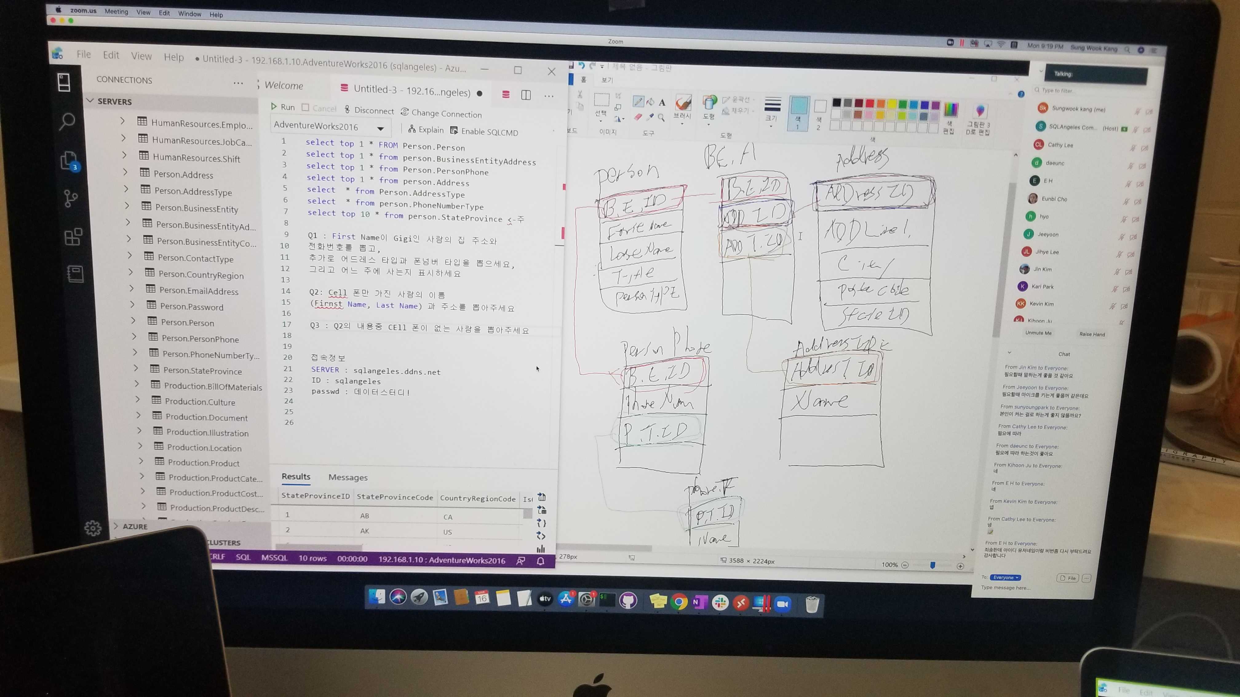 발표자료는 파워포인트로 슬라이드를 만들고, 온라인 강의는 ZOOM이라는 솔루션을 하였습니다. SQL Angeles에서는 최대 100명까지 온라인 스터디에 참여할 수 있는 유료 솔루션을 보유하고 있으며, 다양한 강좌를 온라인으로 운영하고 있습니다. 발표 슬라이드에서 중요한 부분이나 추가 설명을 해야 하는 부분은 노트 기능을 이용하여 그림을 그려가면서 설명하였습니다.