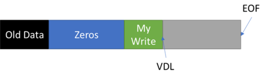 VDL 오프셋 이상으로 쓰기가 발생하면 Windows는VDL을 이동하여 쓰기를 수용하고 이전 VDL과 쓰기 요청 시작 사이의 오프셋에 0을 쓴다.