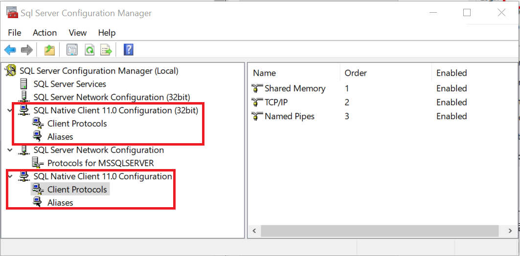대부분 SQL Server를 연결할 때, 프로토콜을 지정하지 않으면 TCP/IP를 사용한다고 생각할 수 있다. 하지만 프로토콜을 지정하지 않으면 TCP/IP를 사용한다는 보장을 할 수 없다. SSMS및 SQLCMD에는 SQL Server 구성관리자의 프로토콜에 따라 순서가 결정된다. 아래 그림은 SQL Server 구성관리자의 프로토콜 구성이다. 구성관리자에는 32bit, 64bit 두 가지 클라이언트 구성이 있다. SSIS를 사용하는 경우 32bit 커넥터를 사용할 수 있기 때문에 중요하다. 패키자가 64bit 버전에서 실행되고 64bit 설정을 하지 않을 경우 패키지가 실패한다.
