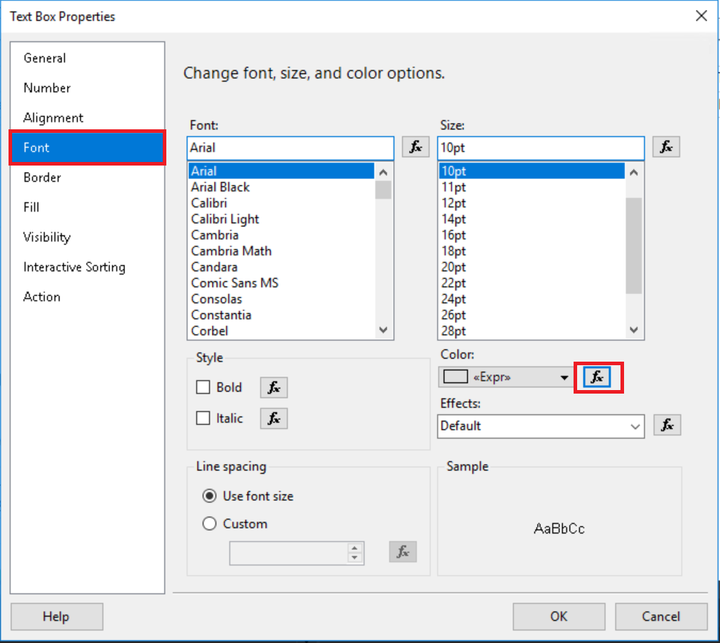 [Text Box Properties] 설정 창이 나타나면 [Font] 탭으로 이동하여 Color 항목의 펑션 버튼(fx)을 클릭한다.