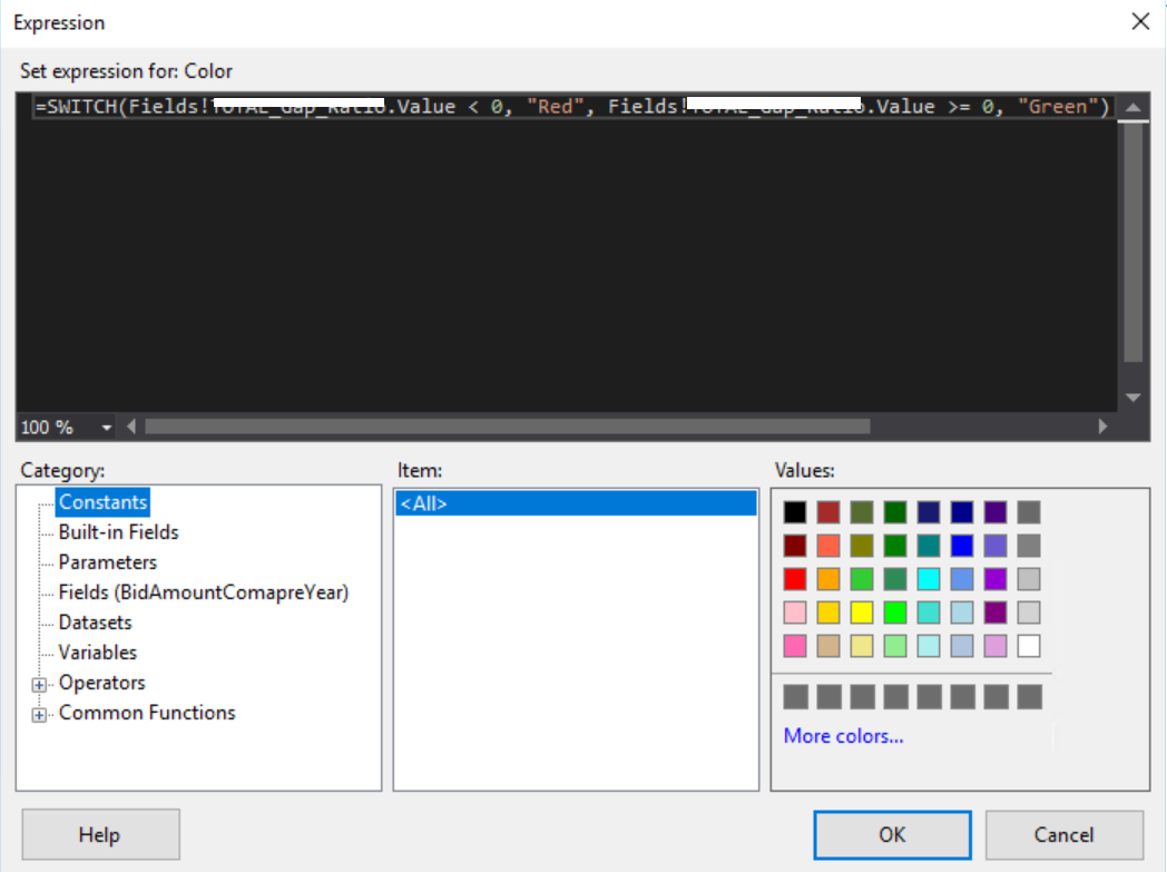 =SWITCH(Fields!Pay.Value <= 10, "Red", Fields!Pay.Value >= 20, "Green") |