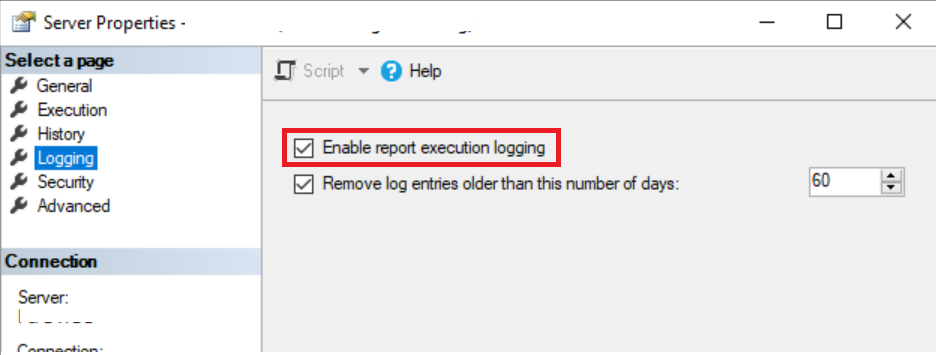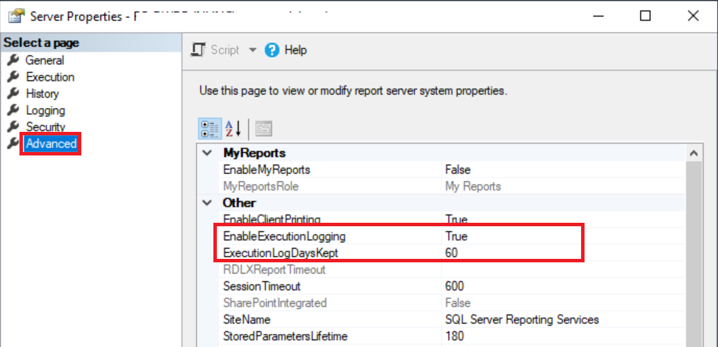 속성창이 나타면 [Logging] – [Enable report execution logging]을 체크하여 활성화 한다.