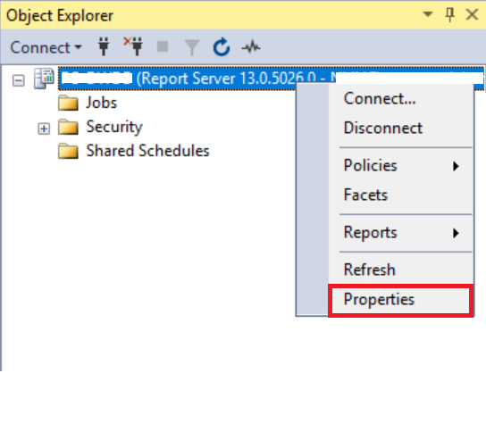 SSRS 서버에 접속 되었으면 서버에서 마우스 오른쪽을 클릭하여 [Properties]를 선택한다.