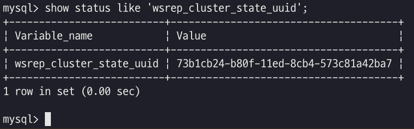 | +----------------------+---------+ | Variable_name | Value | +----------------------+---------+ | wsrep_cluster_status | Primary | +----------------------+---------+ |