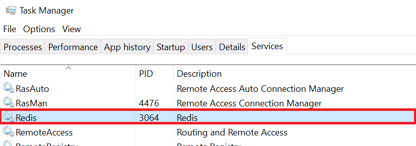 Redis 설치가 완료되면 Task Manager – Services 탭에서 Redis 서비스가 실행중인것을 확인할 수 있다.