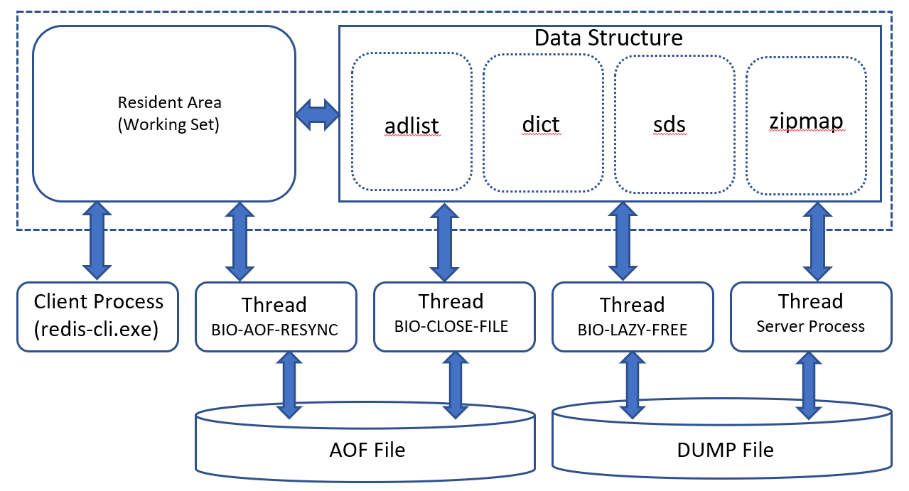 Redis Architecture · Version : Redis 3.2.100 (Windows) 아래 그림은 Redis Server Architecture 이며, 크게 3가지 영역인, 메모리, 파일, 프로세스 영역으로 구성되어 있다. [메모리 영역] · Resident Area (Working Set) : 사용자가 Redis 서버에 접속해서 처리하는 모든 데이터가 가정 먼저 저장되는 영역이며 실제 작업이 수행되는 영역. · Data Structure : Redis를 운영하기 위한 다양한 정보를 저장하고 관리하기 위한 영역. [파일 영역] · AOF 파일 : 메모리에 저장된 사용자 데이터를 파일에 기록하는 영역 (스냅샷 데이터) · DUMP 파일 : 소량의 데이터를 일시적으로 저장할때 사용하는 영역 [프..