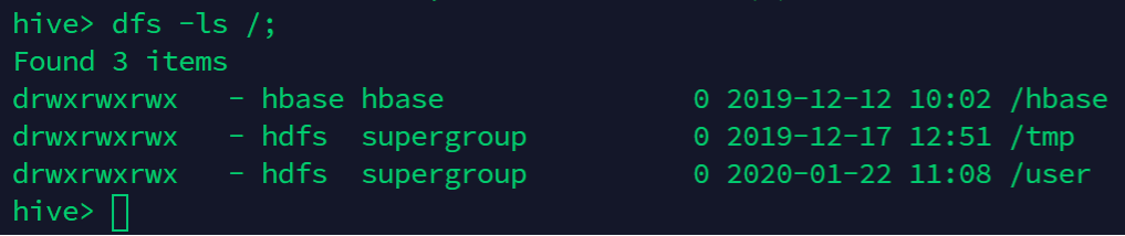Hive에서 하둡(dfs)명령 실행 · Version : Hive 하이브(Hive)에서 하둡(dfs) 명령을 수행할 수 있다. 하이브에서 하둡 명령어를 사용하는 방법은 dfs 를 사용하고 마지막에 세미콜론(;)을 입력한다. dfs -ls /; 하이브에서 dfs 명령을 사용하는것이 배시쉘에서 hadoop dfs 로 동일한 명령을 사용하는것보다 효율적이다. 하이브는 현재 프로세스에서 명령을 수행하는 반면, 배시쉘을 사용할때에는 새로운 jvm 인스턴스를 구동하여 명령을 실행하기 때문이다. 아래와 같이 -help 를 사용하면 dfs에서 제공하는 도움말을 볼 수 있다. 2020-05-18 / Sungwook Kang / http://sungwookkang.com Hadoop, Big Data, 하둡, 빅데이터, ..